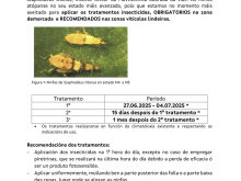 AVISO FITOSANITARIO 1/2025 ZONA DEMARCADA FLAVESCENCIA DOURADA DA VIDE TRATAMENTOS FITOSANITARIOS PARA Scaphoideus titanus. Tratamentos insecticidas, OBRIGATORIOS na zona demarcada e RECOMENDADOS nas zonas vitícolas lindeiras. No noso concello, o tratamento é OBRIGATORIO na parroquia de Santa María e RECOMENDADO no resto do concello.