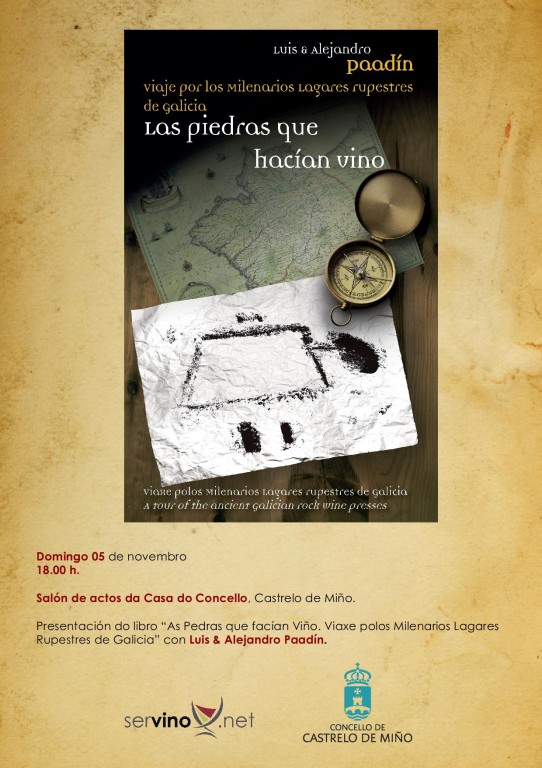 O domingo 5 de novembro ás 18 horas no Salón de Actos do Concello presentación do libro "As pedras que facían viño. Viaxe polos milenarios lagares rupestres de Galicia" con Luis Paadín e Alejandro Paadín.